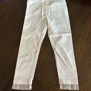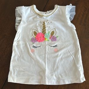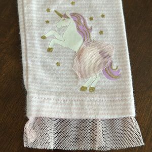 White top with unicorn face and flower appliqués. Coordinating pink and white stripe leggings with unicorn on leg.