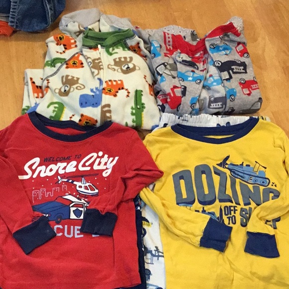 2 pair EUC fleece footie pjs 2 pair of well worn long sleeve and fleece pant pjs. Sleeves are beginning to rip. They were my sons favorite jammies.