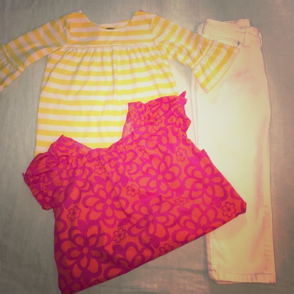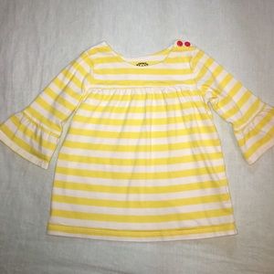 Striking and sweet! Carters bundle of pullover tops. Yellow & white striped top w/ 3/4 bell sleeves and red-button detail at the shoulder (size 5). Orange & magenta patterned tunic (size 6). Both are adorable on! Yellow top is gently worn (minor pilling) / tunic is like new.