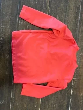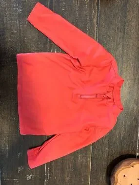 Red long-sleeve swim rashguard with a front zipper. Smooth, stretchy fabric for sun protection. Comfortable fit for active play. Front has little nubbing see photo