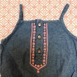Like new, used condition. 12 months sized romper. Snaps in the crotch. Denim with a strong coral embroidery