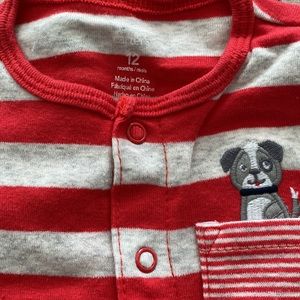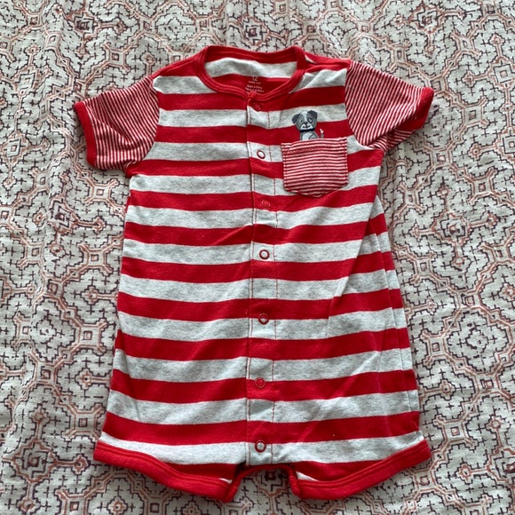 Cute red striped shirt romper. Dog in pocket and on bottom. Washed, never worn.