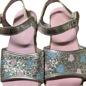 Carters Heart glitter print Velcro strap Size 11 Girl sandals Silver pink and blue hearts