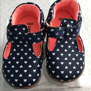 Carter's size 3.5 toddler Mary Janes. They are Stage 2 "Stand." NIB never worn, my daughter was walking before she got to this size and needed something with a harder sole. Navy blue with white hearts and a pink interior.