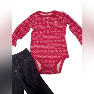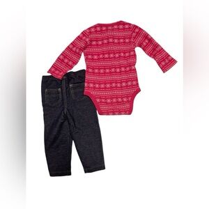 Both items included in bundle and in great condition! Pink long sleeved onesie with buttons and snowflake design. Stretchy jeggings. Both are Carters, size 9 months