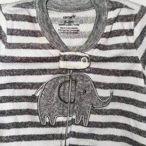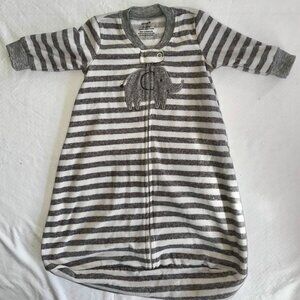 “Carter’s baby wearable blanket (size 0-3 months) in a grey & white striped design with adorable elephant applique. Long sleeves, full zip-front for quick change, ribbed cuffs to stay in place. Excellent pre-owned condition — no stains, pulls or missing zipper. Cozy and safe alternative to loose blankets for newborns, perfect for sleep or nap time. Brand-name Carter’s for baby boy or girl.”
