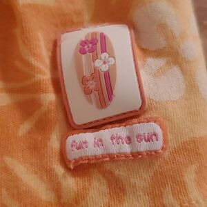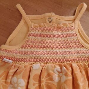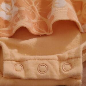 Peach with Orange and white flowers. Snap between the legs. Sleeveless elastic front with ruffle collar.