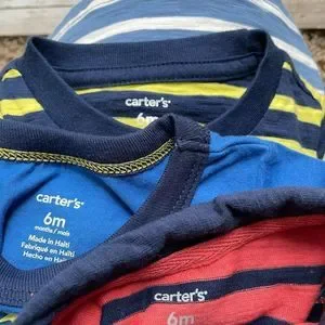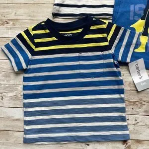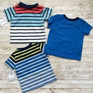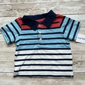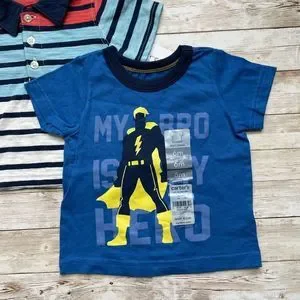 Bundle includes 3 shirts. 2 of them are short sleeve tee shirts. One is striped and the other has”my bro is my hero” on front. The last shirt is a striped polo shirt. NWT. Size 6mo