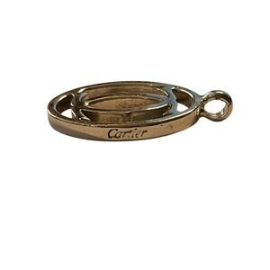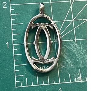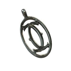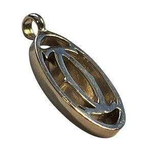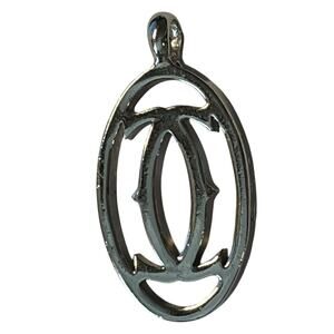 This is a pre-owned, authentic Cartier 2C logo pendant. The pendant features the iconic double C logo, crafted in a silver-toned metal. It is a versatile piece that can be worn as a charm on a necklace, bracelet, or keychain. The item is in great condition with minimal signs of wear and tear, such as light surface scratches, consistent with its vintage nature. Please review all photos for a detailed inspection of the item's condition.