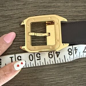 Cartier signature ardillon buckle. Double sided (black/brown) belt. Gently used in great condition. Comes with duster bags for belt and buckle, and box.