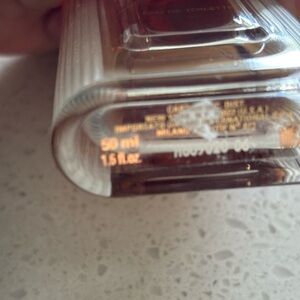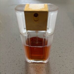 Elegant Cartier fragrance bottle. Features gold detailing. Classic design.