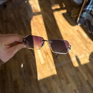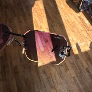 Elegant Cartier sunglasses with a gradient pink lens. Rimless design and sleek black arms.