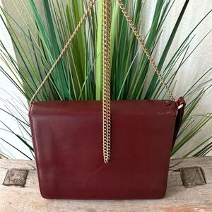 Sophisticated leather vintage wristlet. Features a chic gold tone chain shoulder strap. Ideal for stylish outings. Removable chain.