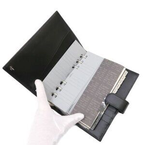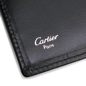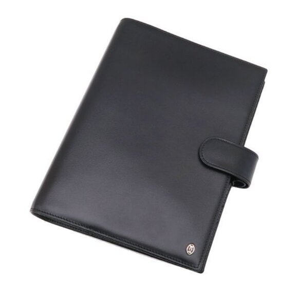 This is an authentic Cartier Notebook Cover in black. The notebook features the Cartier logo embossed on the front cover, and it has a snap closure for secure storage.