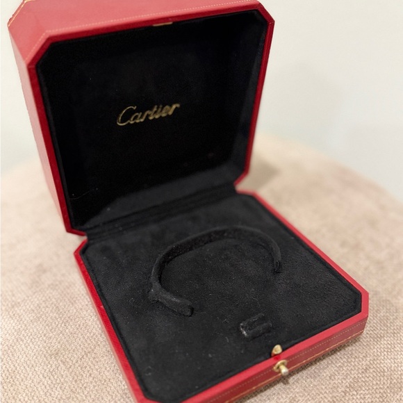 Sleek black bracelet nestled in a red Cartier case. Perfect for elegant occasions.