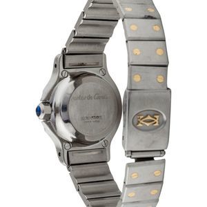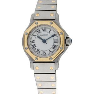 Stainless steel and 18K yellow gold 24mm Cartier Santos Octagon watch featuring an automatic movement, fixed bezel, white dial with blued steel hands, octagonal crown set with a blue spinel cabochon and link bracelet with deployant clasp.
