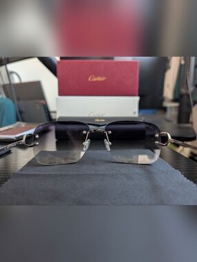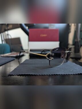 Cartier style rimless sunglasses with silver finish and black gradient lenses.