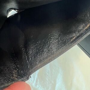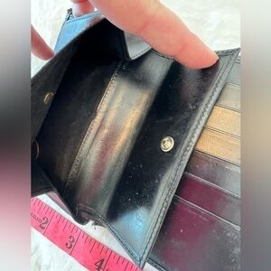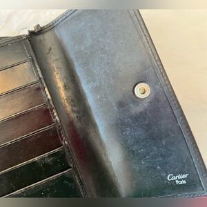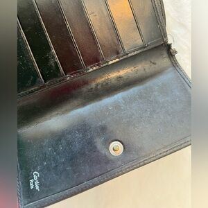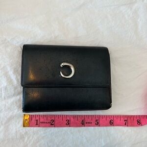 Used black leather, silver tone hardware, Panthere accent on front. Many compartments. Super classy.