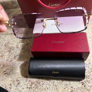 Elevate your style with these elegant Cartier sunglasses. Featuring a chic pink lens and luxurious gold accents, these sunglasses are perfect for any occasion.