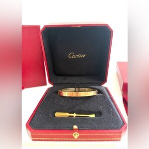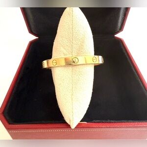An authentic Cartier Love Bracelet in 18K yellow gold, Size 18, purchased in December 2016. This iconic piece comes with the original Cartier red box, screwdriver, suede pouch, and certificate of authenticity.