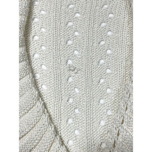 Cute knit crop cardigan boutique style sweater by Cartise. Tag reads Large but fits more like a Juniors Large or womens Small. Acrylic, hand wash, lay flat to dry. Cream color. Fits cropped and has long ties that can wrap around to create a snug fit or front tie. Silver accent beads on end of ties. Inside of the sweater on the back has a loose stitch, you cannot see it from the outside of the sweater. There is a number 8 in silver on the size tag. Please see pics. Cute ruffle style collar. Good weight, sweater, not too thin, over 1 lb.