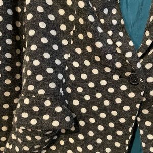 Chic black blazer adorned with white polka dots. Tailored fit with a modern touch. Ideal for versatile styling.