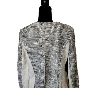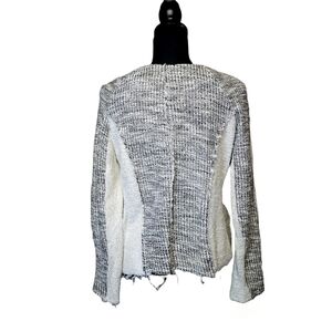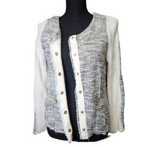 Classic style knit jacket, raw edges with snap front. Two front shallow zipper pockets both are clean free of holes stains and snags. Cream and grey in color with a gold Metallic weave throughout. Unlined witha round neck great wardrobe staple piece super cute with some denim and flats or fall booties!