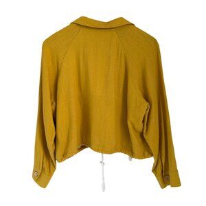 This mustard yellow cropped jacket tells a tale of effortless charm and utility. Its chic design, accented with button closures and a drawstring hem, brings a delightful mix of form and function. Whether layering for crisp mornings or breezy evenings, it promises timeless style with a modern twist.