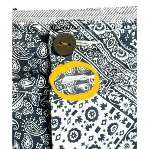 Cartonnier by Anthropologie Bandana printed shorts. Navy blue and white bandana geometric printed rolled hem shorts. Has a side and back pockets with navy trim. Does have a button missing as you can see in the picture where I circled. Other than that they are in great condition. Size 6. Made of 6% cotton and 4% spandex.