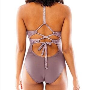 Fun and flirty, a new customer favorite one piece with color blocking and V-neck. Features T strap and criss-cross tie construction with low back and medium leg cut.