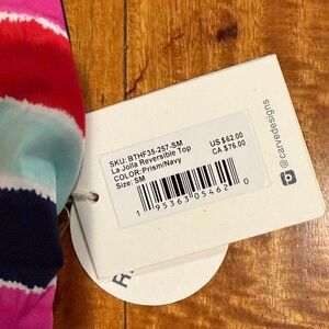 Brand new with tags. Stylish bikini top with vibrant multicolor stripe design. Features a mix of red, pink, and blue shades. Size small