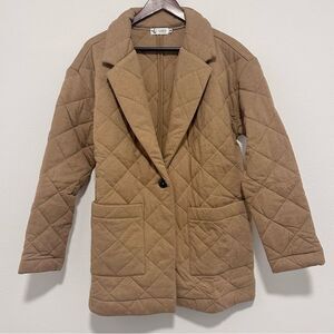 Quilted peacoat style jacket/ shacket, lightweight polyester filling, one button closure, collar, front patch pockets, relaxed fit