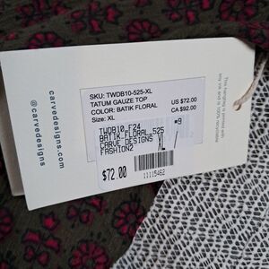 Carve Designs NWT Organic Cotton Tatum Guaze Top XL Batik Floral Green Pink