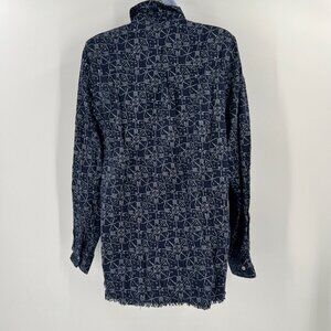 A lightweight, breathable women's shirt made from organic cotton and rayon. Featuring a navy geometric print, button-up front, and long sleeves for casual wear.