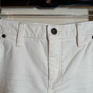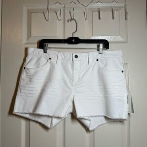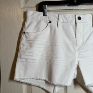 Stylish white denim shorts with frayed hem. Ideal for summer outings.
