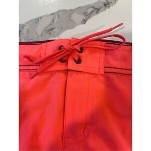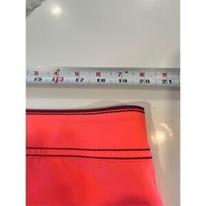 In excellent condition no issues. 7” inseam, stretch, polyester spandex blend, vibrant neo orange with black trim, pocket in back with Velcro closure