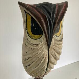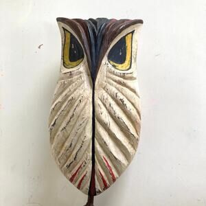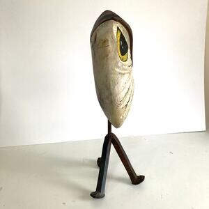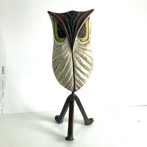 Carved Barn Owl on wrought iron white big eyes MCM Farmhouse curious Angry