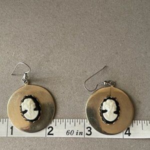 Carved Cameos Set on Black Stone Scalloped Framed on Gold Medallion Hook Earrings Gorgeously Vintage