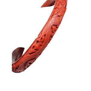 Carved Dragon & Floral Cinnabar Bangle Bracelet Scarlet Red Highly Detailed SZ8