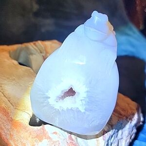 Large hand crafted from Agate Crystal. Iguana perched on a rock. Colors are an opaque off white to a blueish grey. The front of the rock has a small druzy, showing mini crystals inside. It's a nice piece for crystal or prehistoric collectors. Measures 3-5/16" long by 2-1/2" wide by 4" tall at the head. Sculpture weighs 1 lb 6 oz or 612 grams. This is a one of a kind piece. Check out all the photos.
