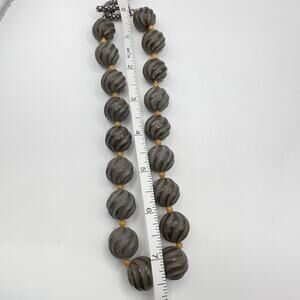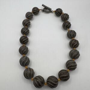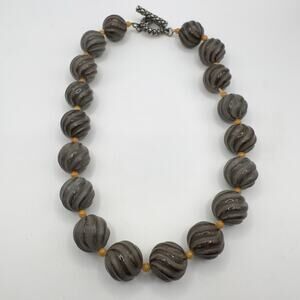 Vintage Carved Brown Stone Bead Necklace Melon (Agate/Jasper??) Sterling Toggle