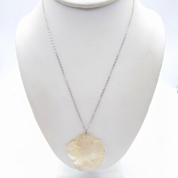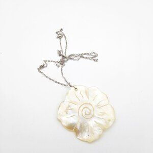 Carved Mother of Pearl Flower Pendant Necklace, Vintage Floral on Delicate Sterling Silver Chain