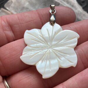 Pendant of a carved hibiscus flower in mother of pearl shell, with a silver toned bail.