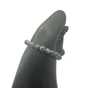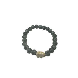 This charming bracelet features a carved stone elephant charm on a beaded stone stretch cord. Its earthy tones and unique design make it a standout piece.