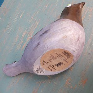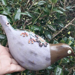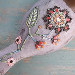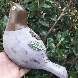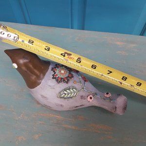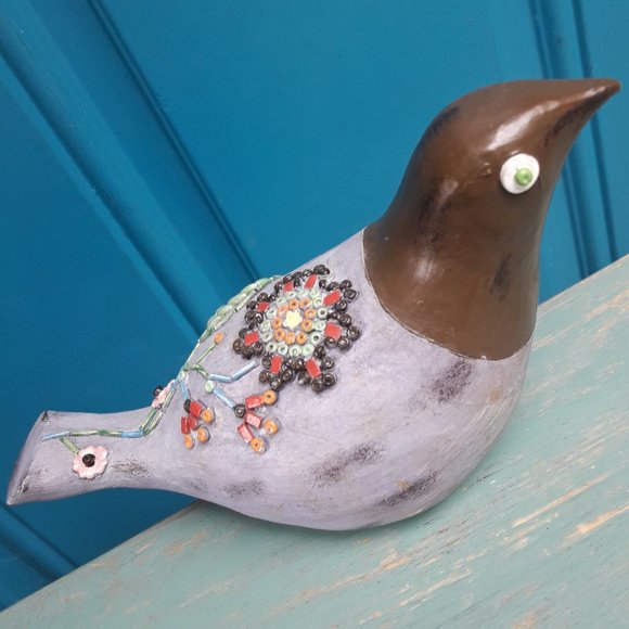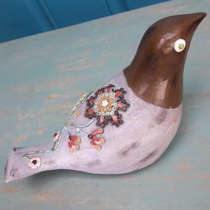 Carved Wood Bird Boho Hippie Decor Wooden Bird Figurine Embellished Beaded Art Bird with Lavender or Grey body and green eyes Wonderful beading in shape of a flower along top. Adorable and wonderful gift idea for any bird lover home decor.