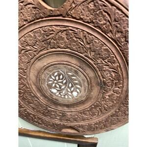 Carved Wood Tray with Inlaid Mother of Pearl Flowers 14.5"