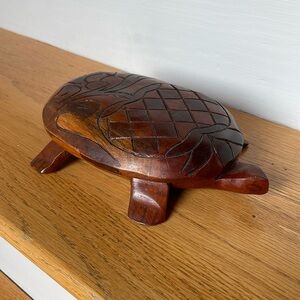 A beautifully detailed carved wooden turtle with removable lid to store small trinket items.