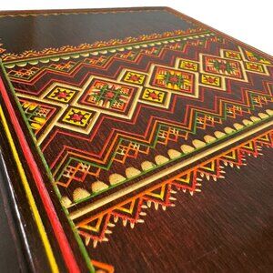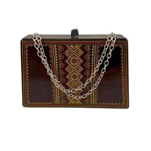 Carved Wooden Box Purse Chain Handles Fabric Lined Vintage Tiki Boho Hippie
