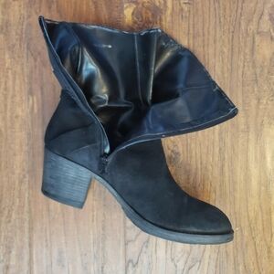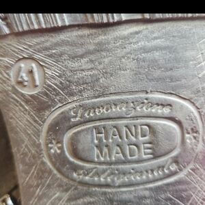 stylish silver tone buckles, almond shape toes, distressed leather and anti slip rubber soles. All hand made and built to last. The inner top leather portion of the boots has minor wear. See pics. The mid section sewn on strap has an opening of about 11”. It is not adjustable. Comes from a smoke free home.