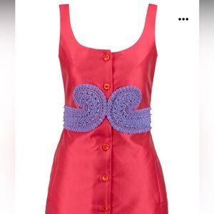 Beautiful pink mini dress, lined with pink buttons and purple beaded detailing. Perfect for Valentines Day! Has a beautiful sheen feel and look. Pockets. Appears red in pictures. Definitely more of a salmon pink.